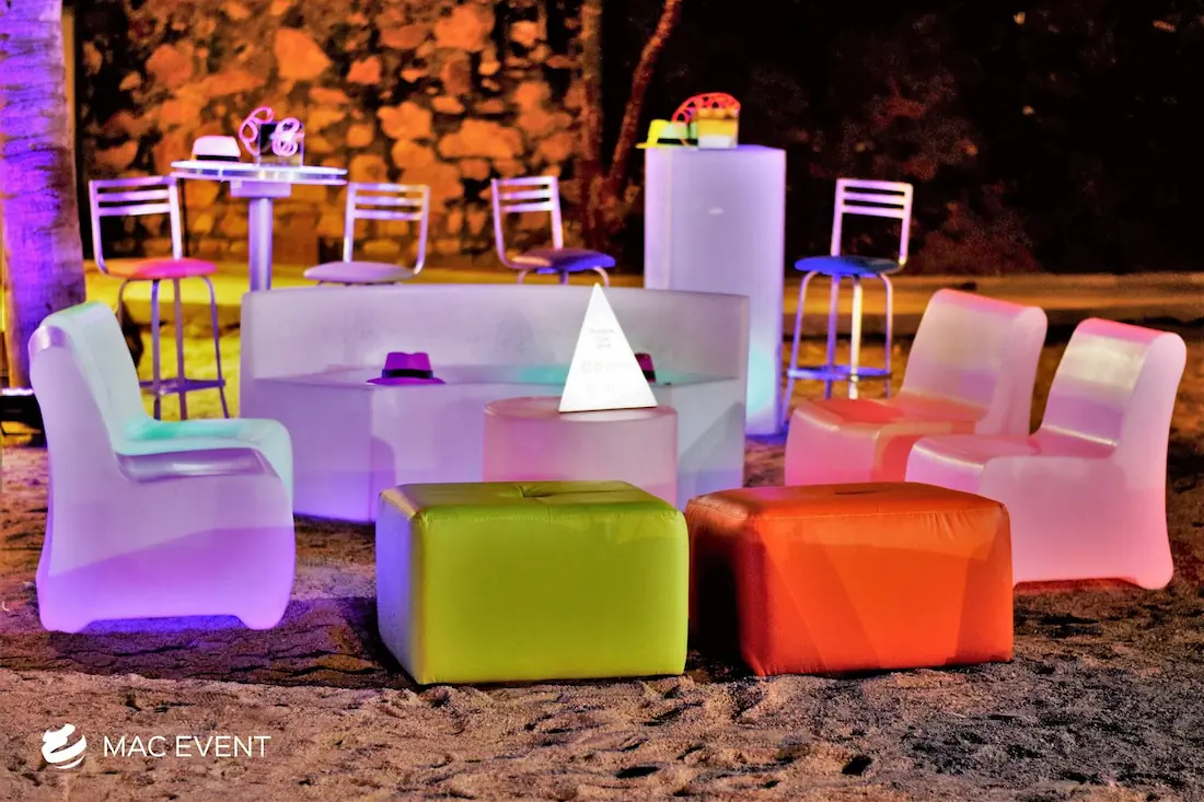 Create a vibrant and dynamic atmosphere with our illuminated lounges, perfect for weddings and events in Rosarito. These lounges feature built-in lighting, adding a unique and stylish element to your seating areas.