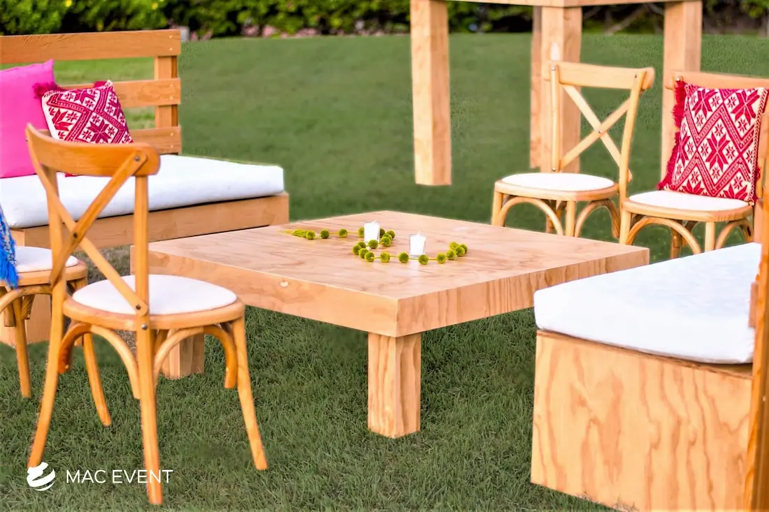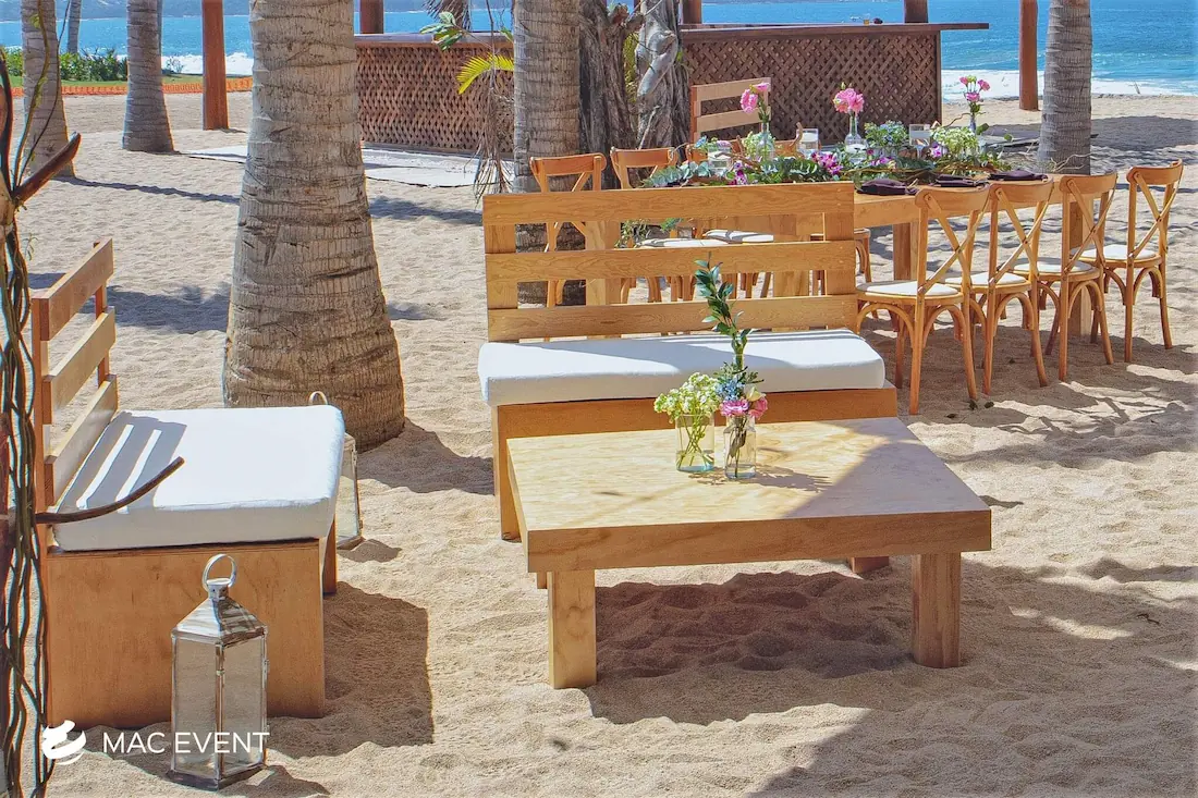Our natural coffee tables are perfect for eco-friendly and rustic-themed weddings and events in Rosarito. Made from high-quality materials, these tables offer a natural and organic look that blends seamlessly with nature.